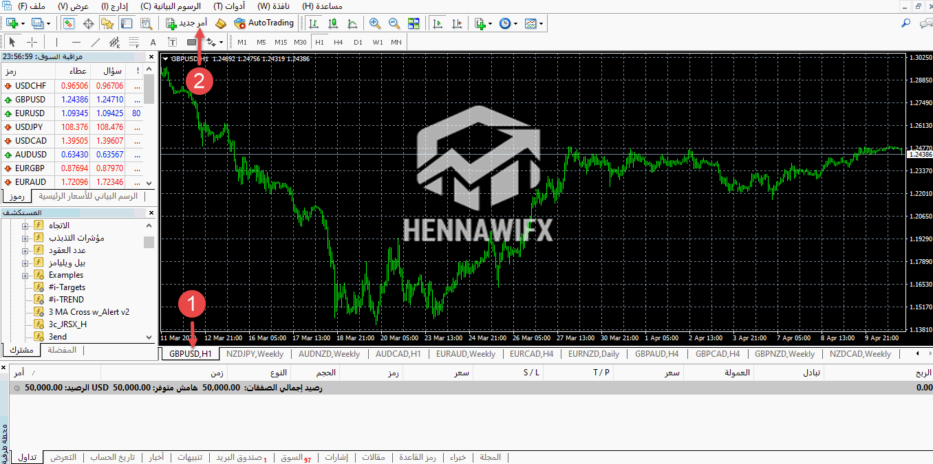 1- عليك اختيار زوج العملات الذي تريد المتاجرة عليه لتضغط بالماوس عليه وفي المثال الحالي زوج العملات المختار هو gbpusd / باوند دولار .