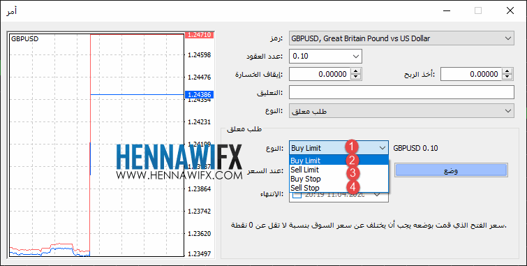 1. buy limit امر شراء معلق (نتوقع الارتداد) : نتوقع ان الاسعار ستهبط الى سعر معين فنضع الامر عند السعر المتوقع الوصول اليه ليفعل امر الشراء وتصعد الاسعار ويبدأ الربح .