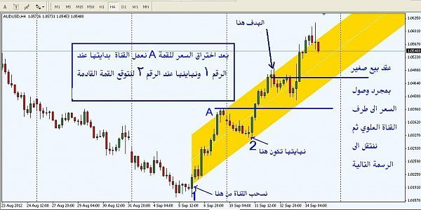 . أحيانا يكون السعر في مسار صاعد ويستطدم السعر في طرف القناة العلوي ومنها نعمل بيع لكن نلاحظ احياننا ان السعر يمشي في مسار عرضي الى ان يصل الى طرف القناة السفلي هنا نغلق عقد البيع فورا ونفتح شراء بمجرد ملامسة السعر لطرف القناة السفلي للقناة الصاعدة والهدف الحد العلوي للقناة .